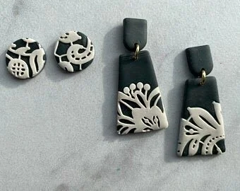 These clay earrings are renderings of lace. They are great with solid colors or paired with matching fabrics.